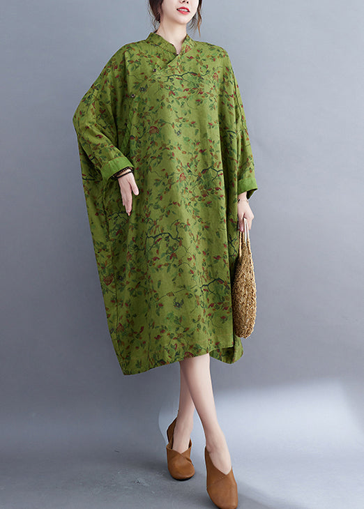Vintage Green Oversized Print Linen Long Dress Batwing Sleeve