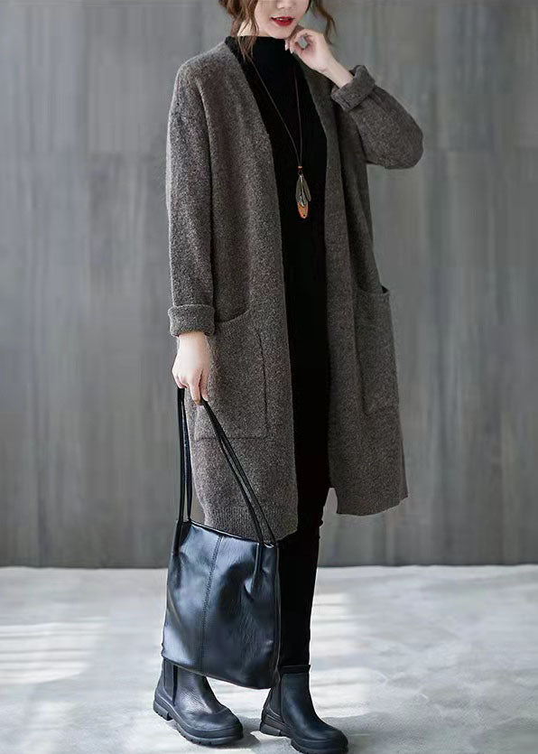 Vintage Khaki Plus Size Clothing Fall V-Neck Knit Outwear