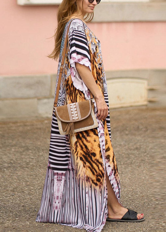 Vintage Orange Side Open Print Long Beach Dresses Short Sleeve