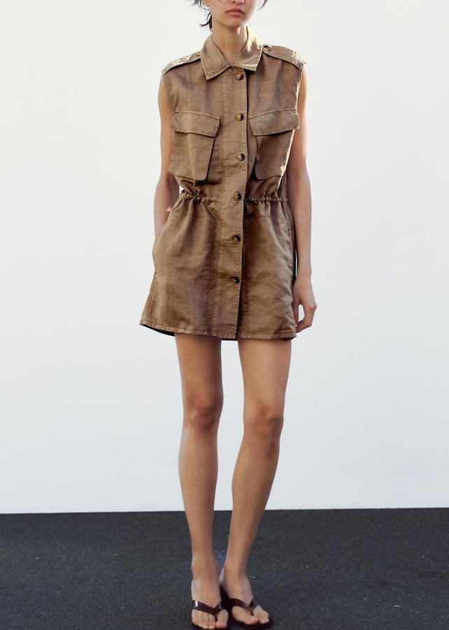 Vintage Tan Peter Pan Collar Button Cotton Mid Dress Sleeveless