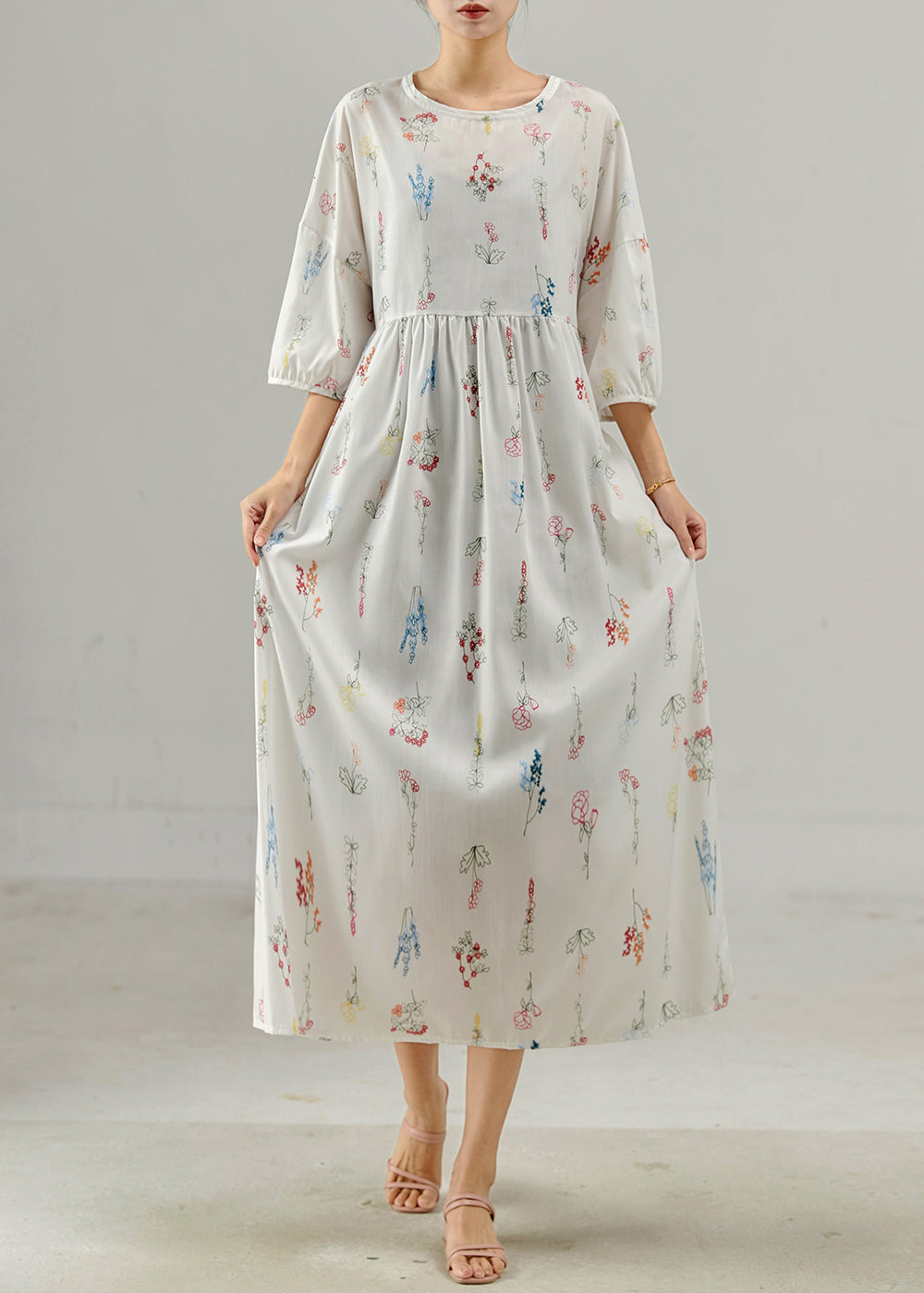 Vintage White Oversized Print Cotton Long Dresses Bracelet Sleeve