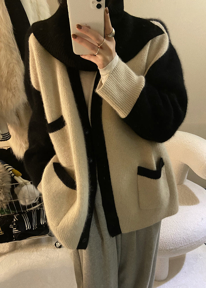 Vogue V Neck Patchwork Pockets Cotton Knit Cardigans Long Sleeve