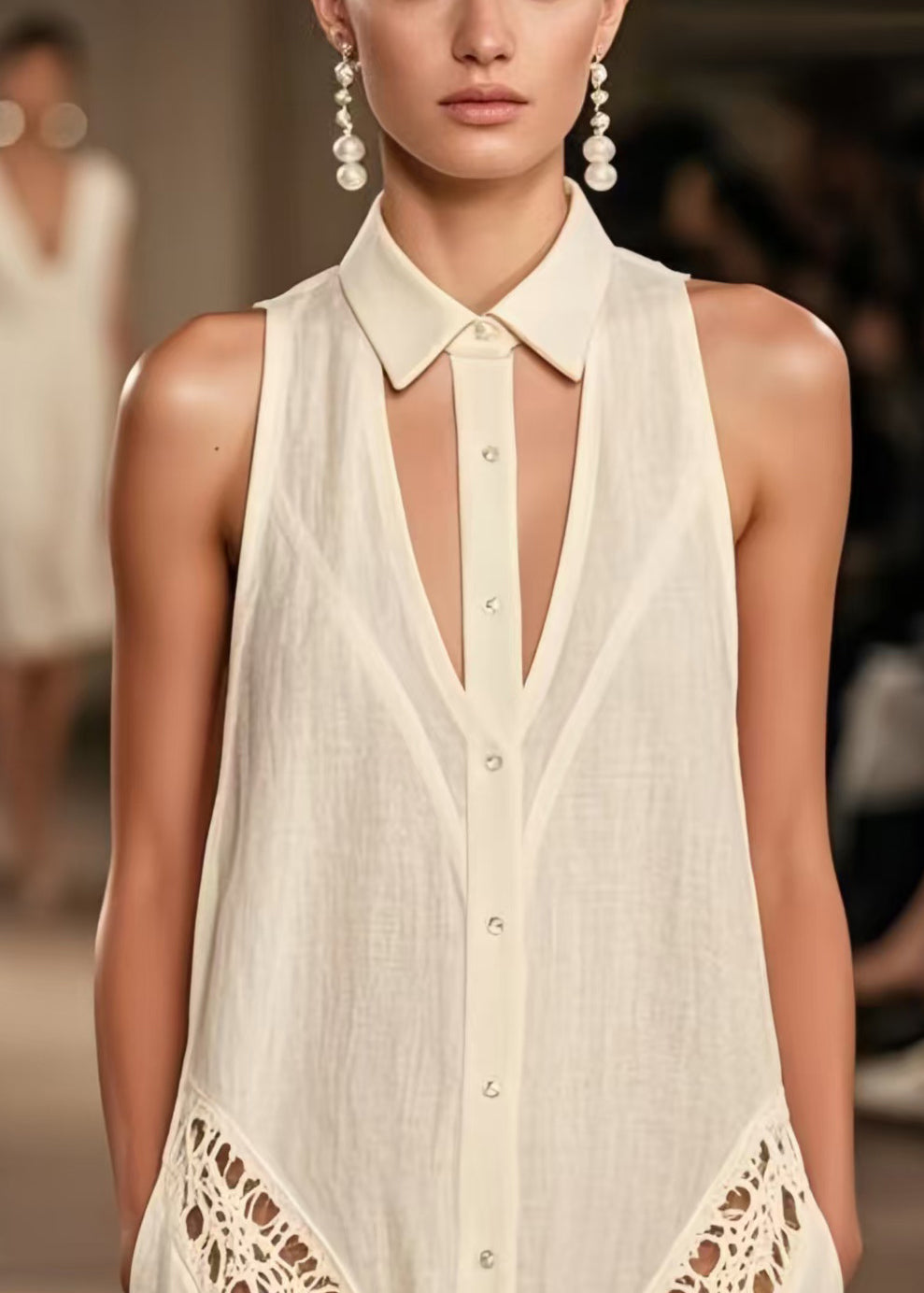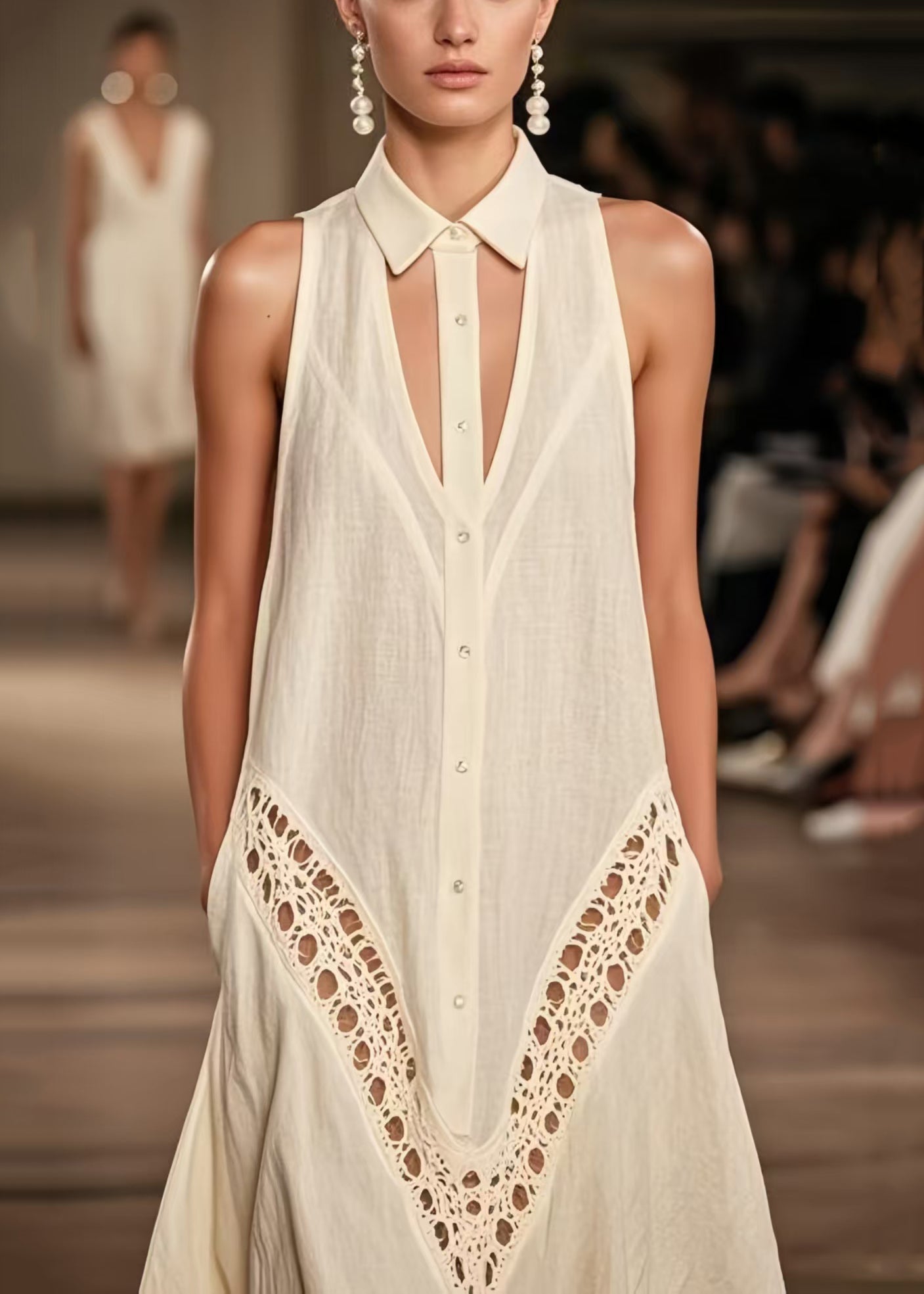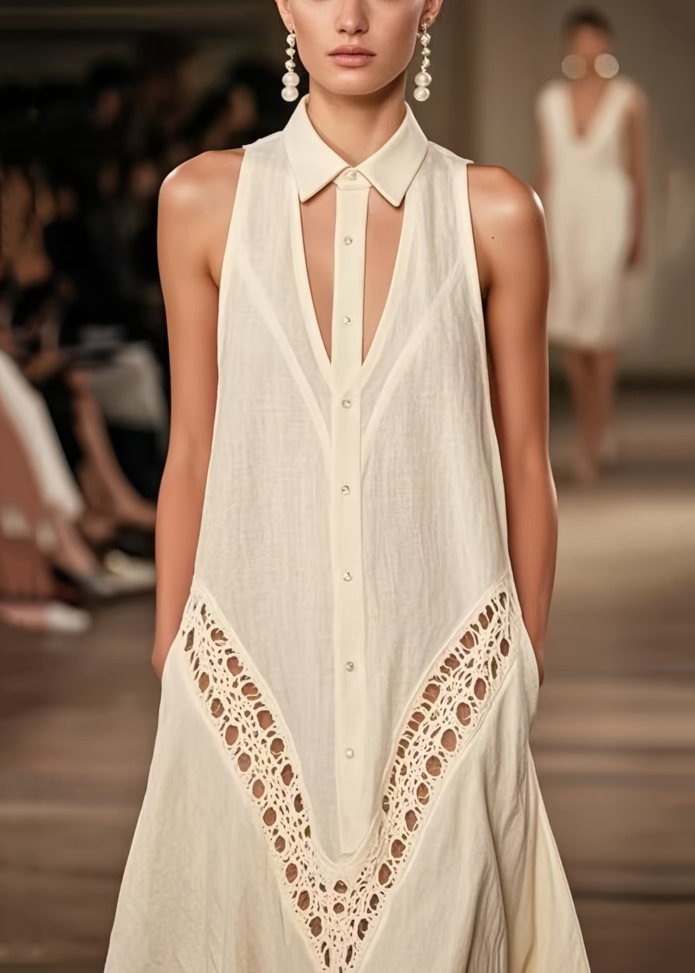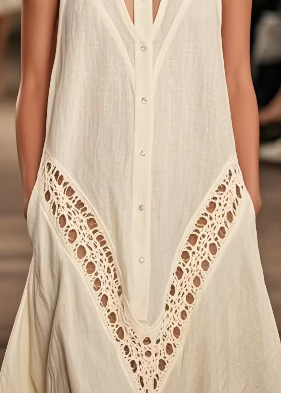 Women Beige Cold Shoulder Hollow Out Cotton Day Dresses Sleeveless