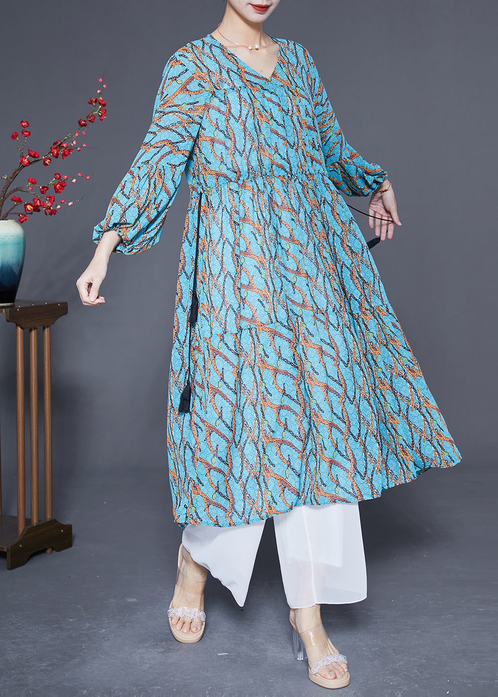 Women Blue Cinched Print Chiffon Holiday Dress Spring