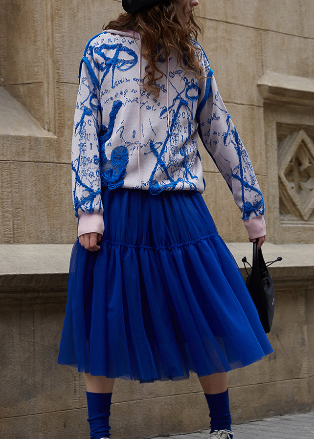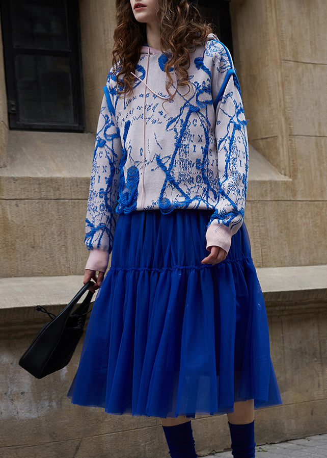 Women Blue Pink Hooded Jacquard Knit Sweater Fall