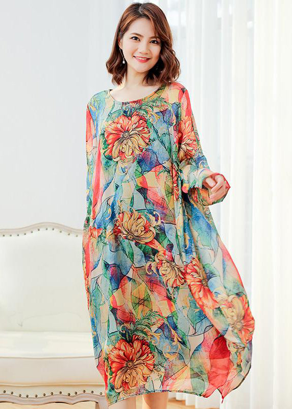 Women Floral Loose Polyester Split Vintage Midi Dress