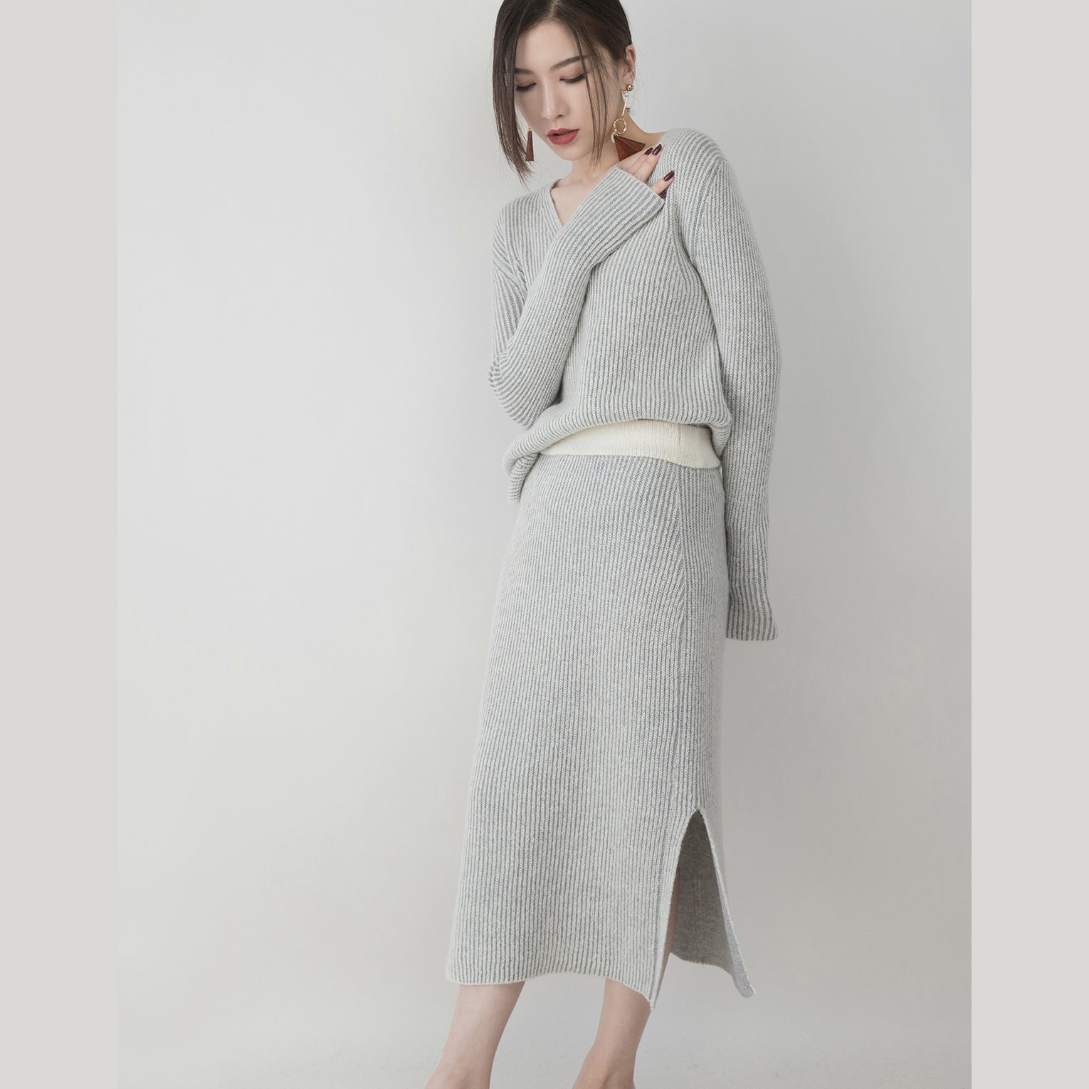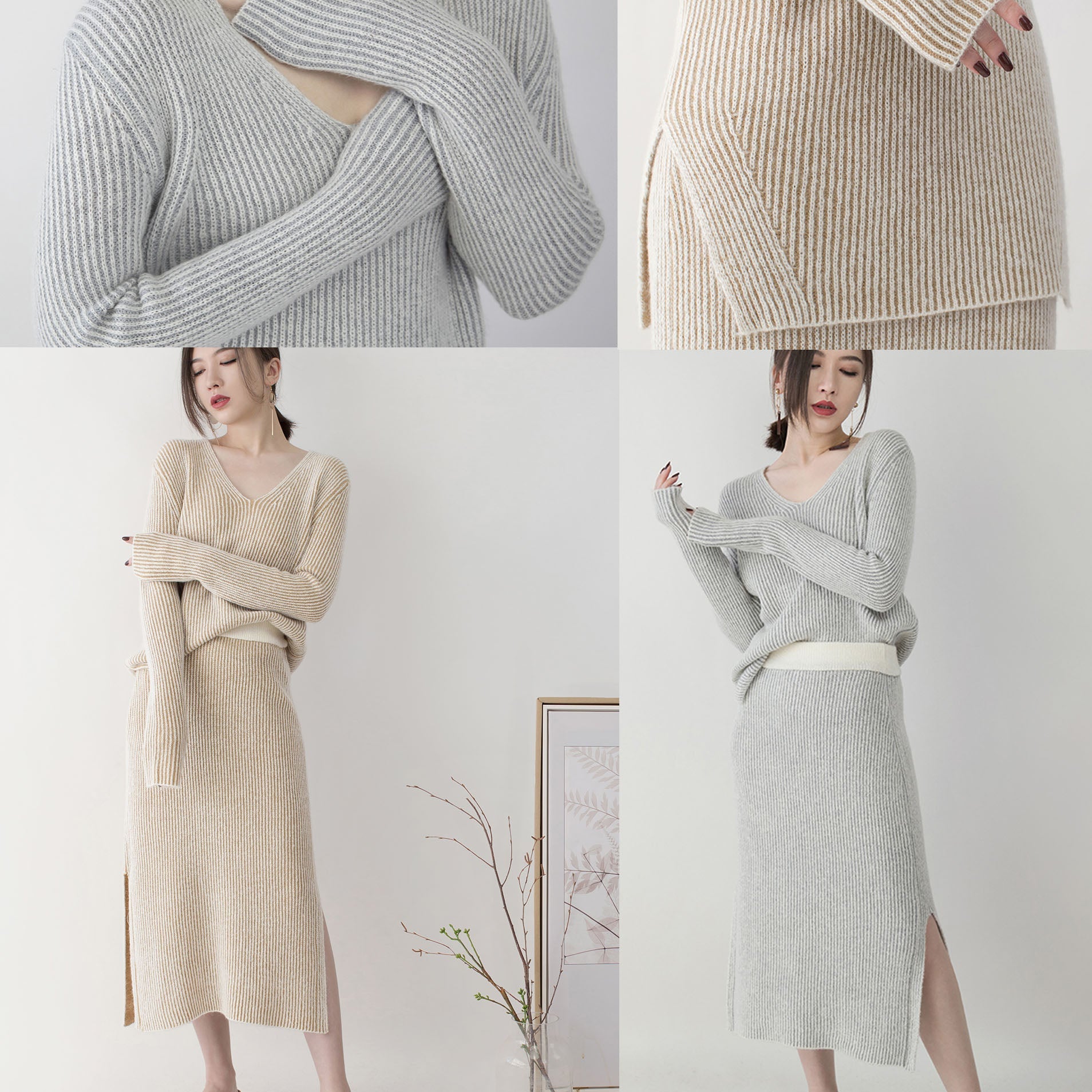 women gray knit sweaters plus size clothing v neck knitted blouses vintage side open skirt two pieces