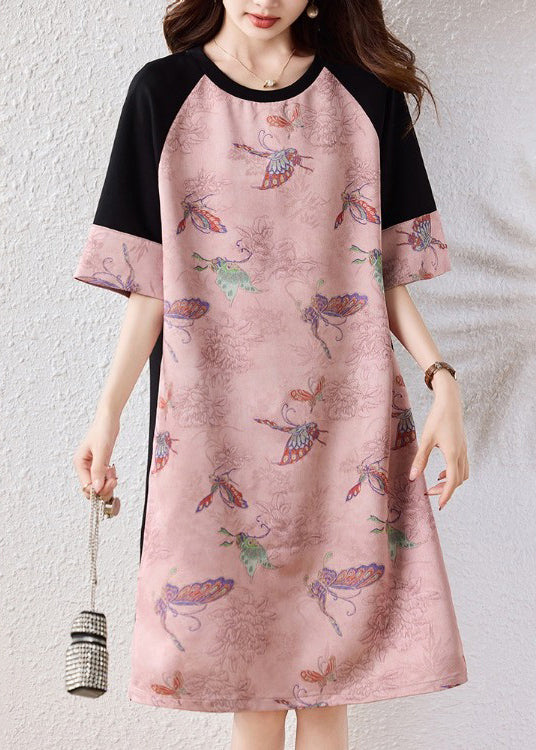 Women Pink Butterfly Patchwork Cotton A Line Dresses Half Sleeve