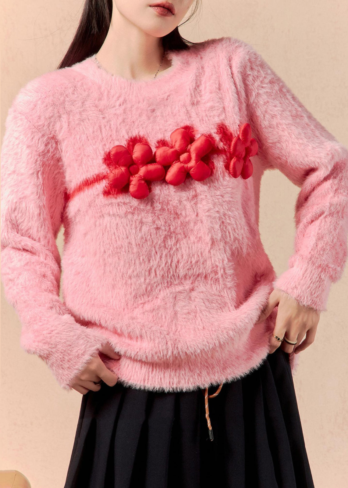 Women Pink O Neck Floral Mink Hair Knitted Sweaters Winter