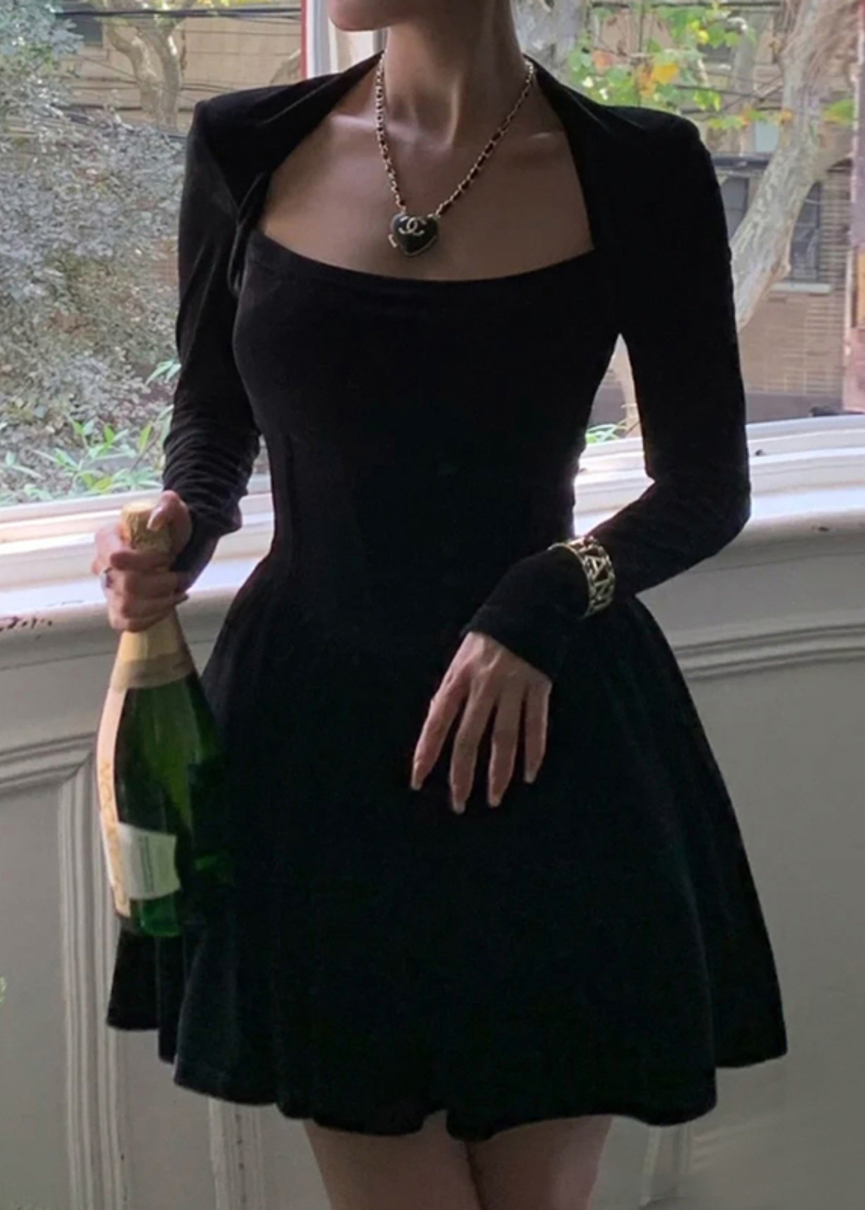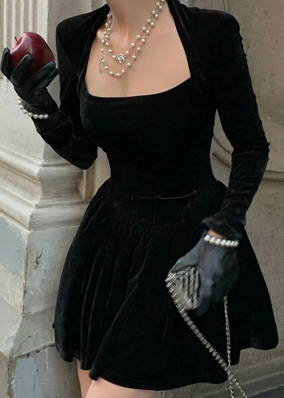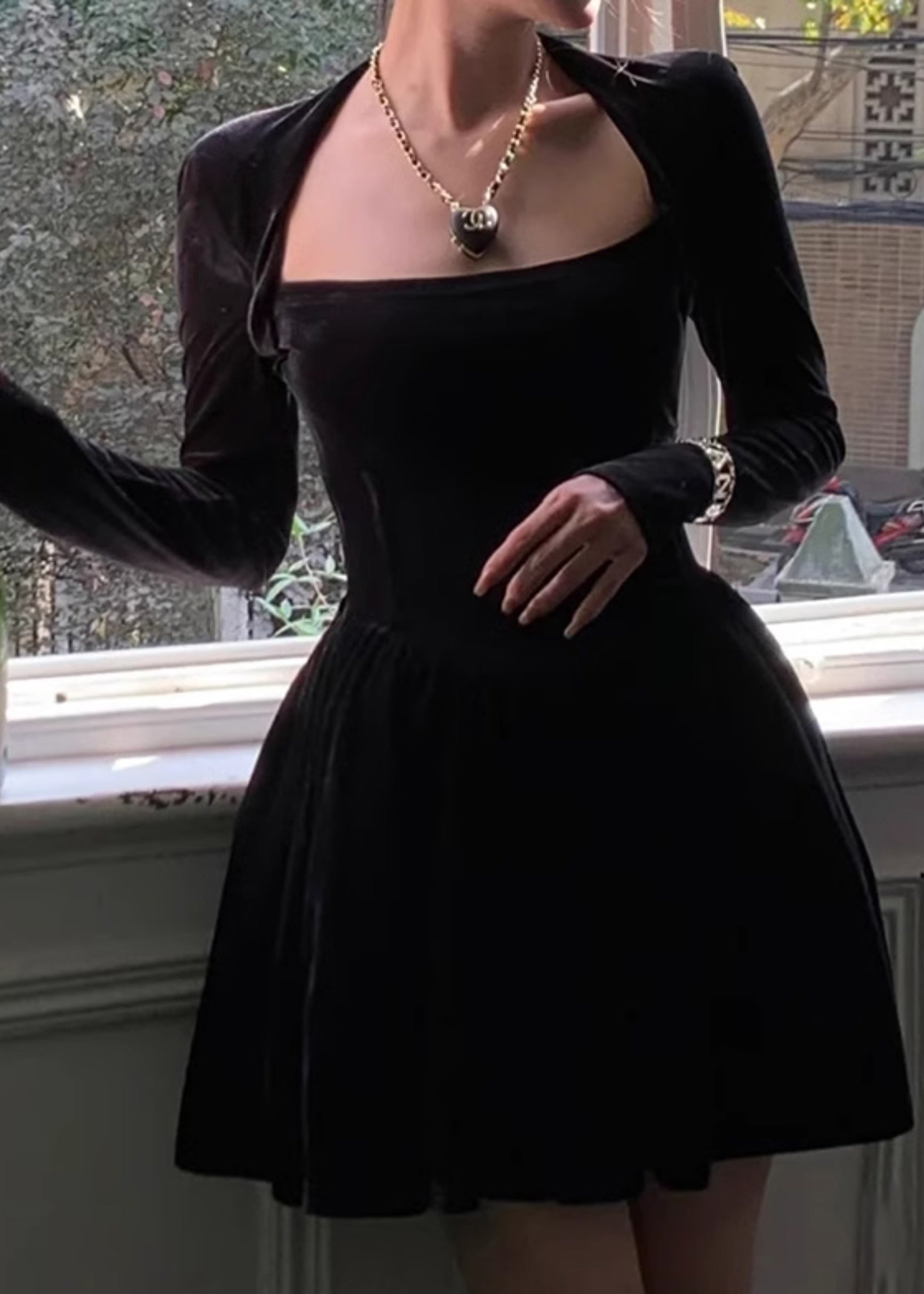Women Red Square Collar Solid Silk Velvet Mid Dress Spring