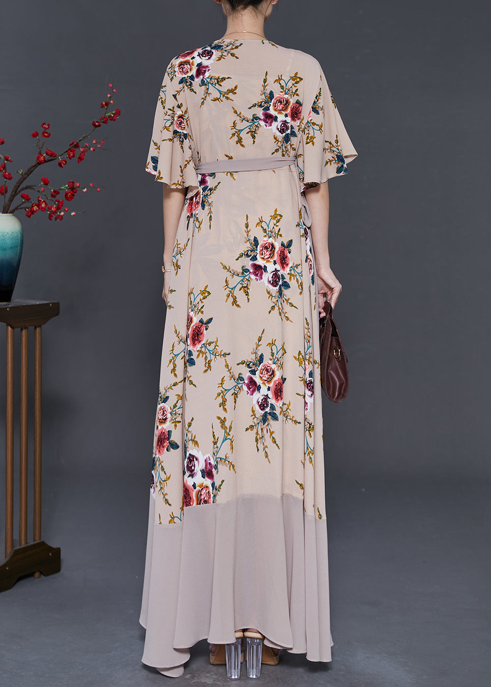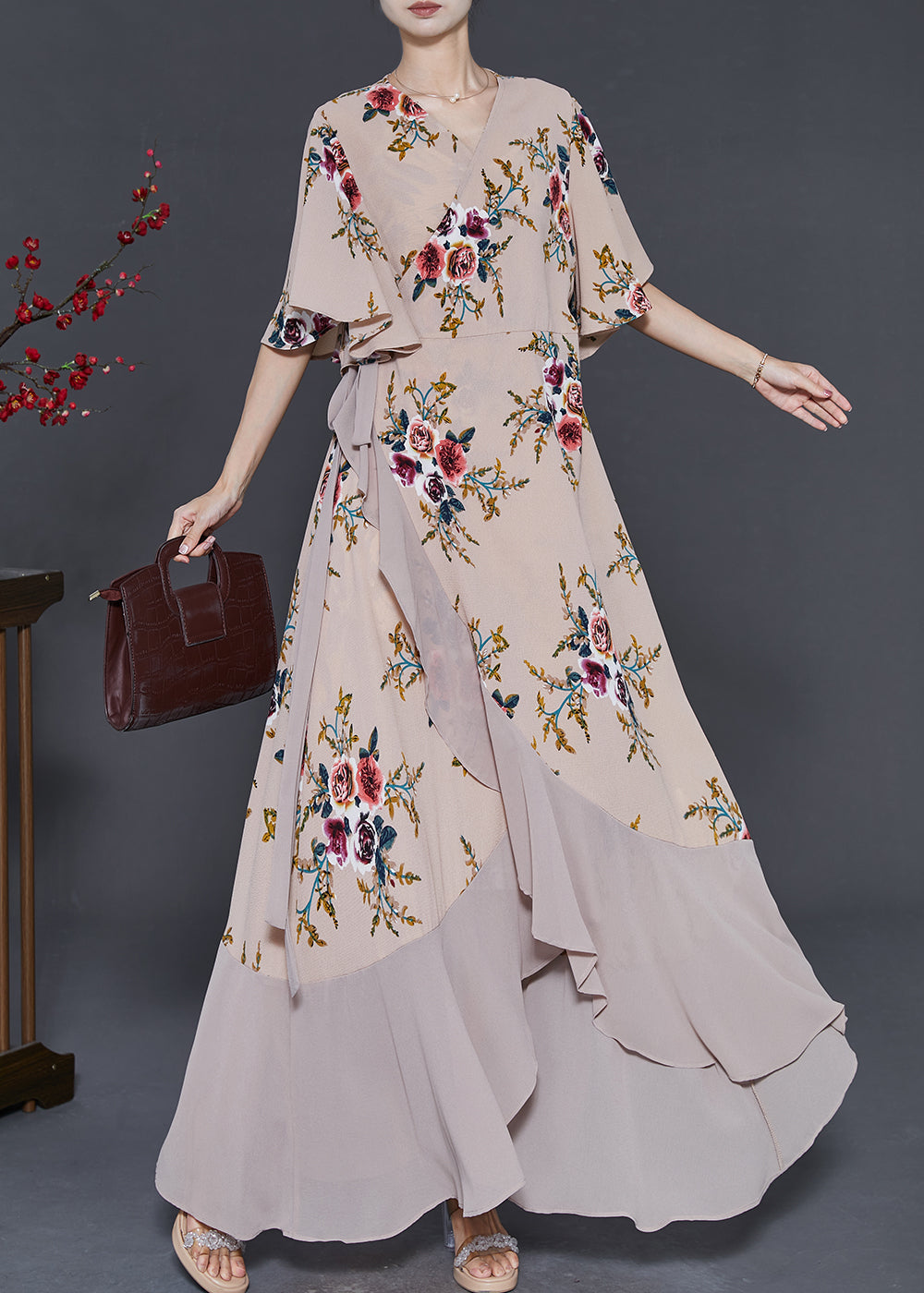 Apricot Print Chiffon Long Dresses Exra Large Hem Cloak Sleeves