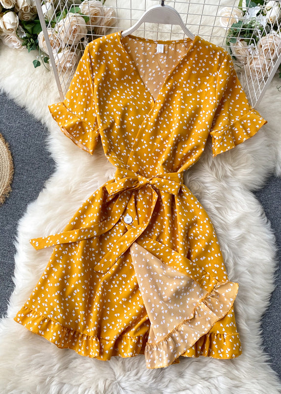 Art Green V Neck Print Tie Waist Cotton Mid Dress Summer