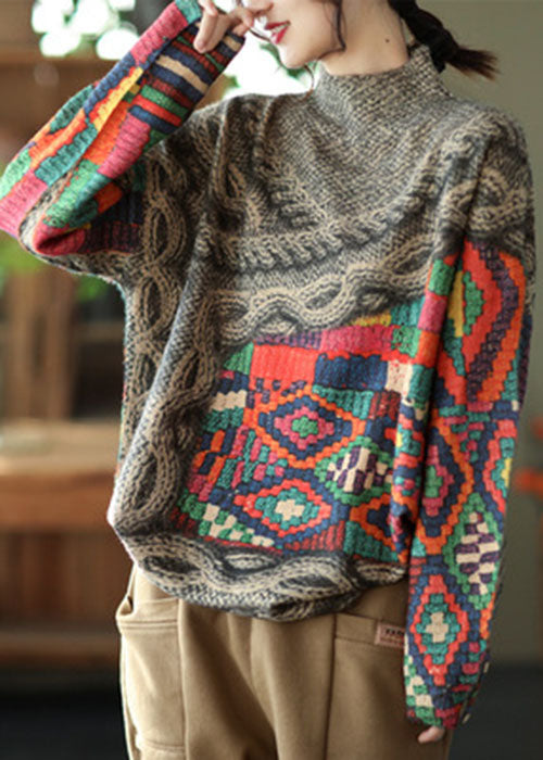 Art High Neck Tie Dye Print Mink Hair Knitted Sweater Tops Winter