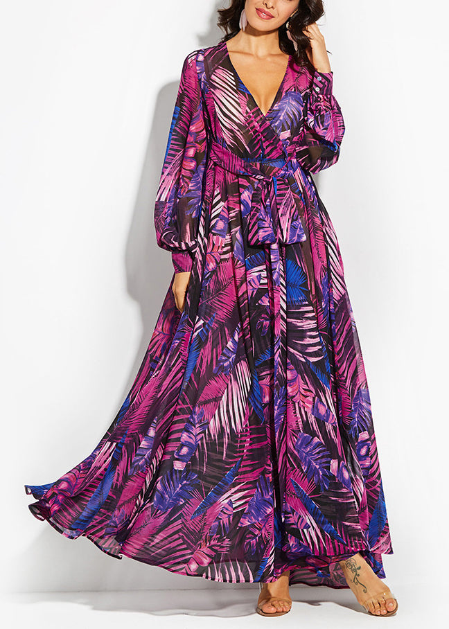 Beautiful Green V Neck Print Lace Up Cotton Maxi Dresses Spring