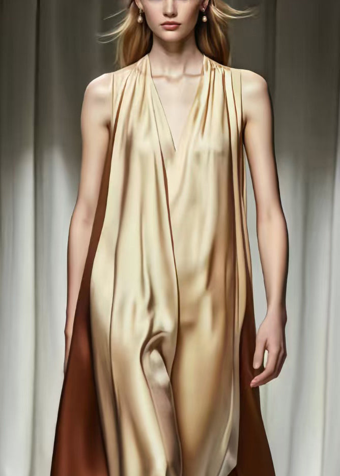 Beautiful Khaki V Neck Patchwork Silk Robe Dresses Summer