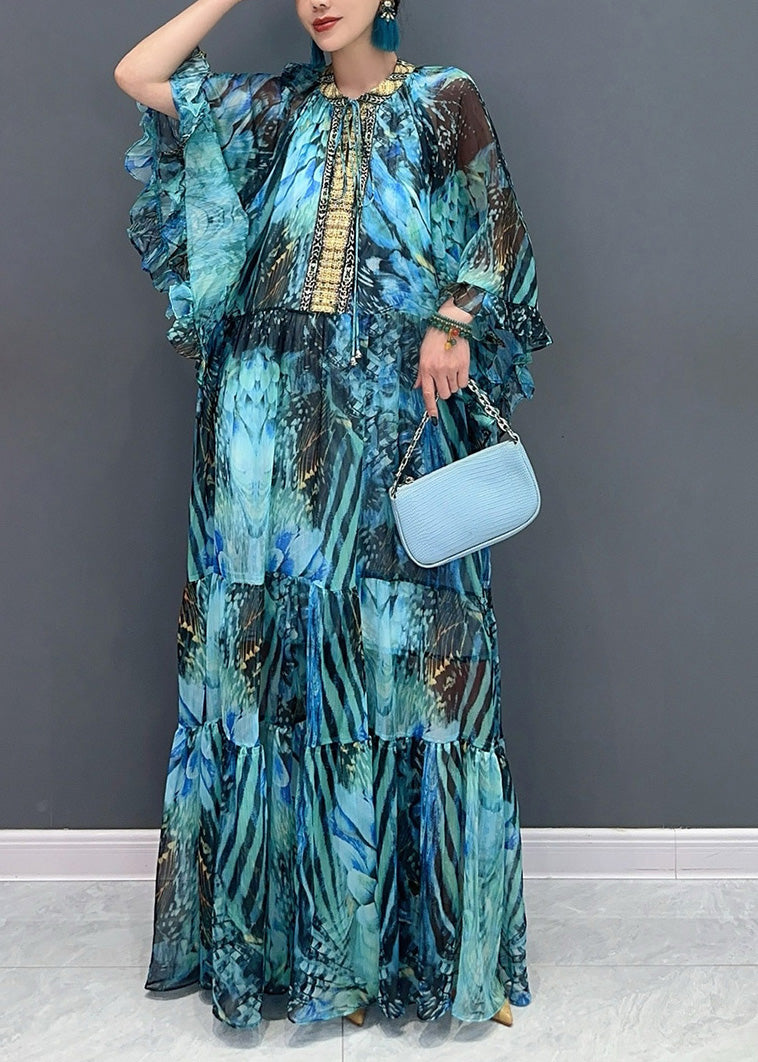 Beautiful Pink Flower Ruffled Chiffon Maxi Dress Batwing Sleeve
