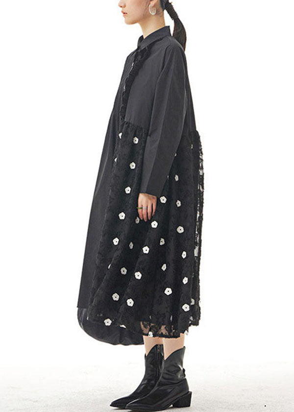 Black Patchwork Cotton Shirts Dresses Peter Pan Collar Spring
