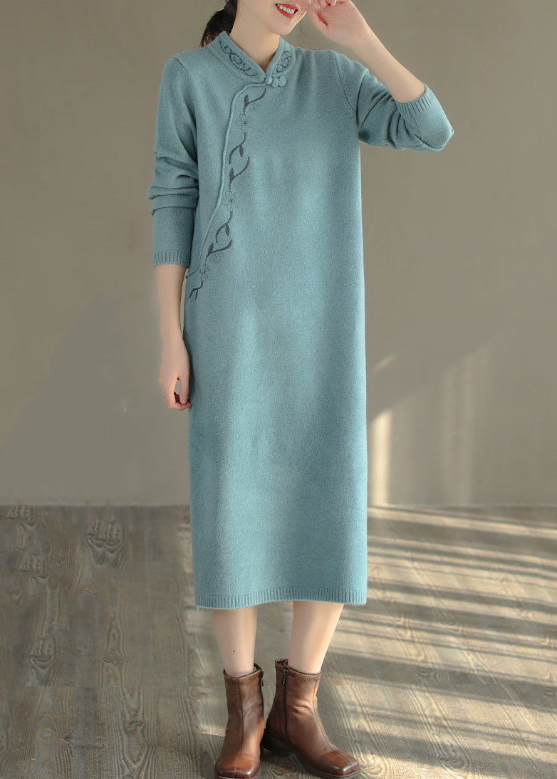 Blue Oriental Long Knit Dress Embroideried Side Open Winter