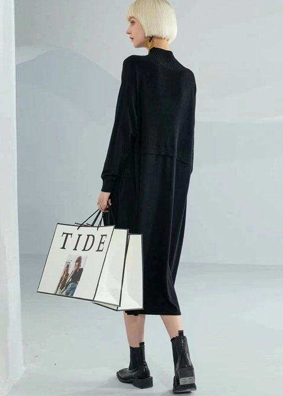 Bohemian Chocolate Turtle Neck Patchwork Solid Wool Knit Sweater Dress Long Sleeve