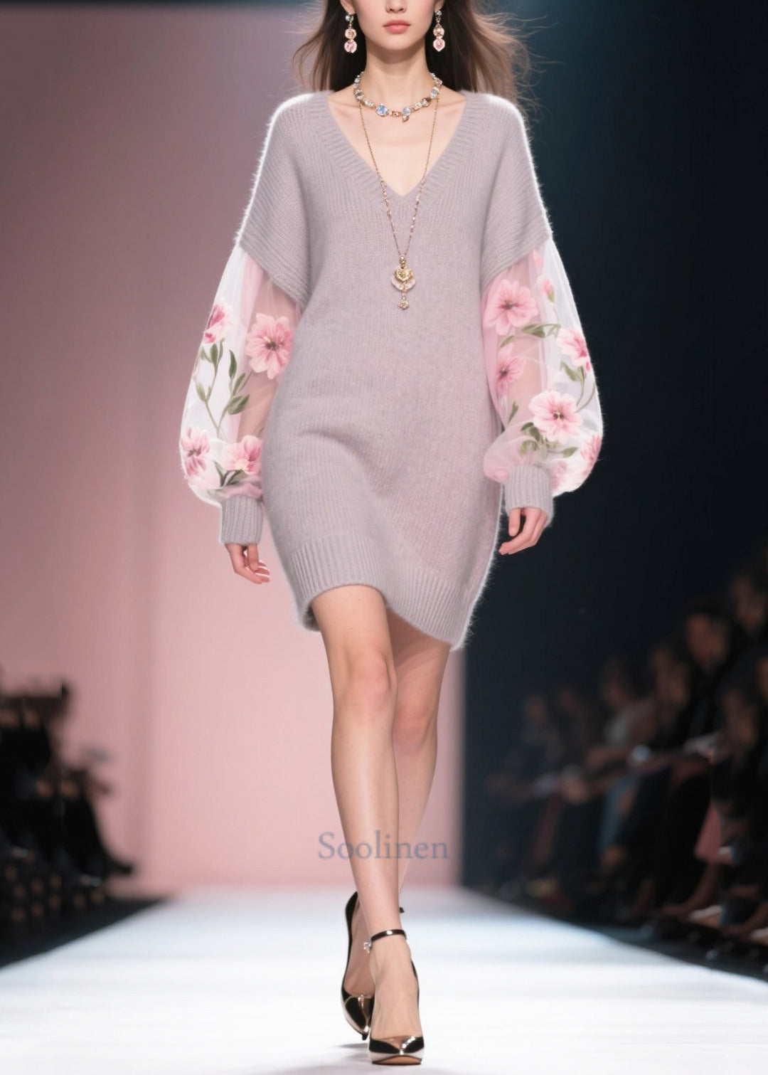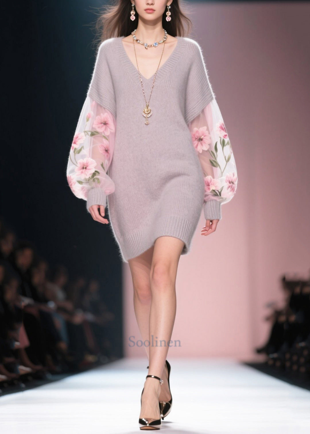 Boho Grey V Neck Patchwork Tulle Knit Dress Winter