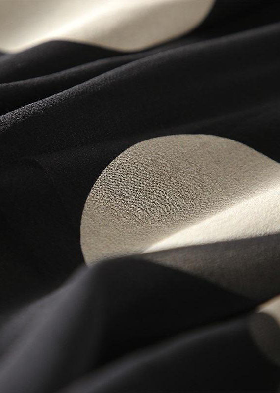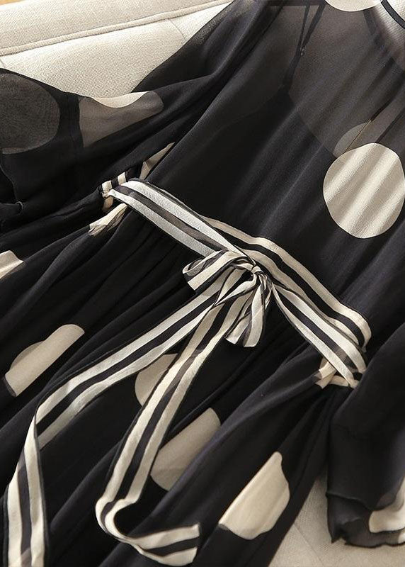 Boutique Black O-Neck Tie Waist Dot Print Chiffon Long Dresses Flare Sleeve