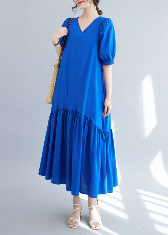 Boutique Blue V Neck Ruffled Patchwork Silk Long Dresses Summer