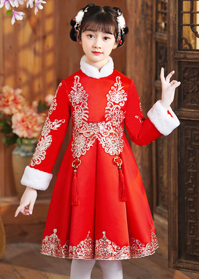 Boutique Red Fur Collar Embroideried Girls Shawl And Dress Two Piece Set Winter