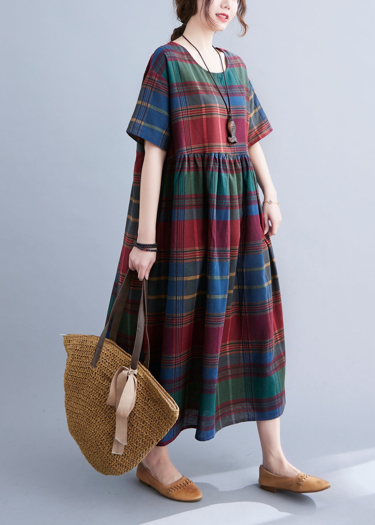 Boutique Red Plaid O-Neck Wrinkled Cotton Long Dress Short Sleeve