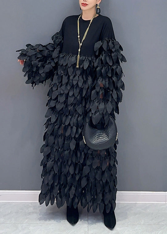 Chic Black O Neck Patchwork Cotton Long Dress Spring