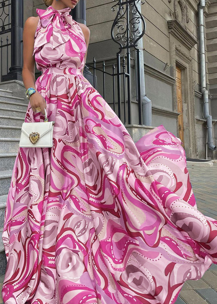 Chic Blue Bow Print High Waist Cotton Maxi Dress Summer