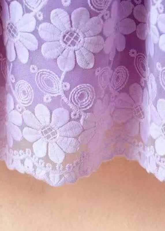 Chic Purple O-Neck Embroideried Floral Patchwork Tie Waist Tulle Kids Mid Dress Long Sleeve