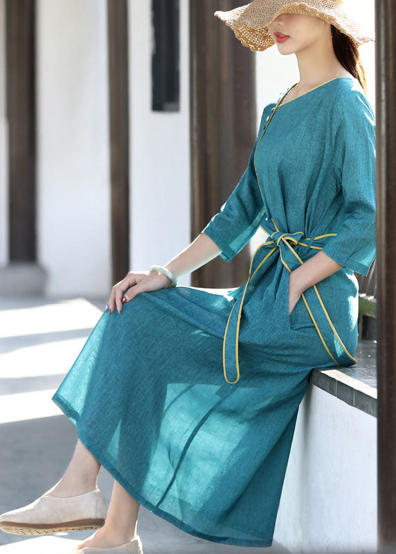 Elegant Blue Asymmetrical Patchwork Tie Waist Long Dress Half Sleeve
