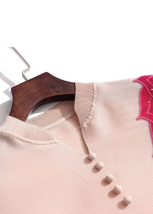 Fashion Apricot Stand Collar Wrinkled Print Silk A Line Dress Short Sleeve