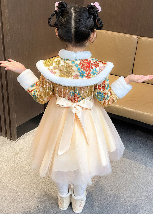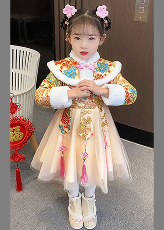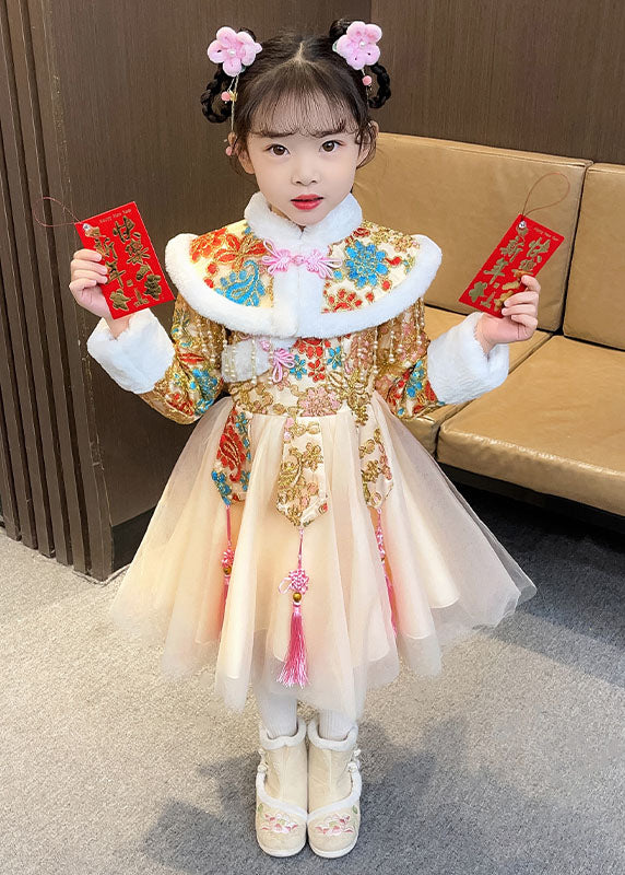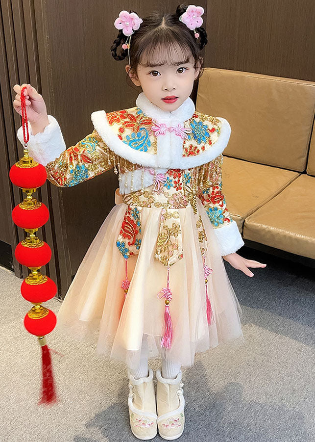 Fashion Champagne Fuzzy Fur Fluffy Warm Button Girls Shawl And Long Dress Two Pieces Set Winter