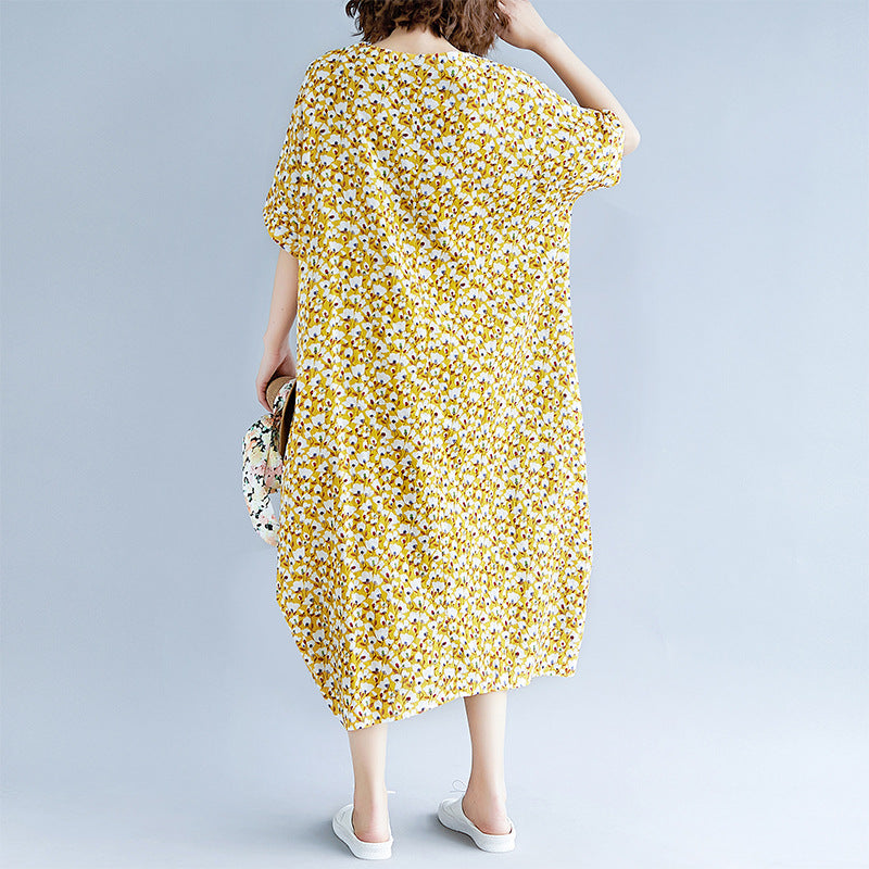 fashion yellow cotton linen dresses casual print short sleeve cotton gown fine o neck dresses