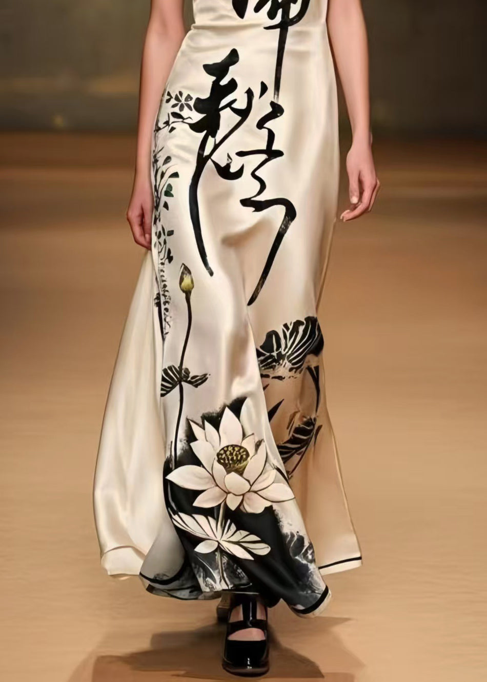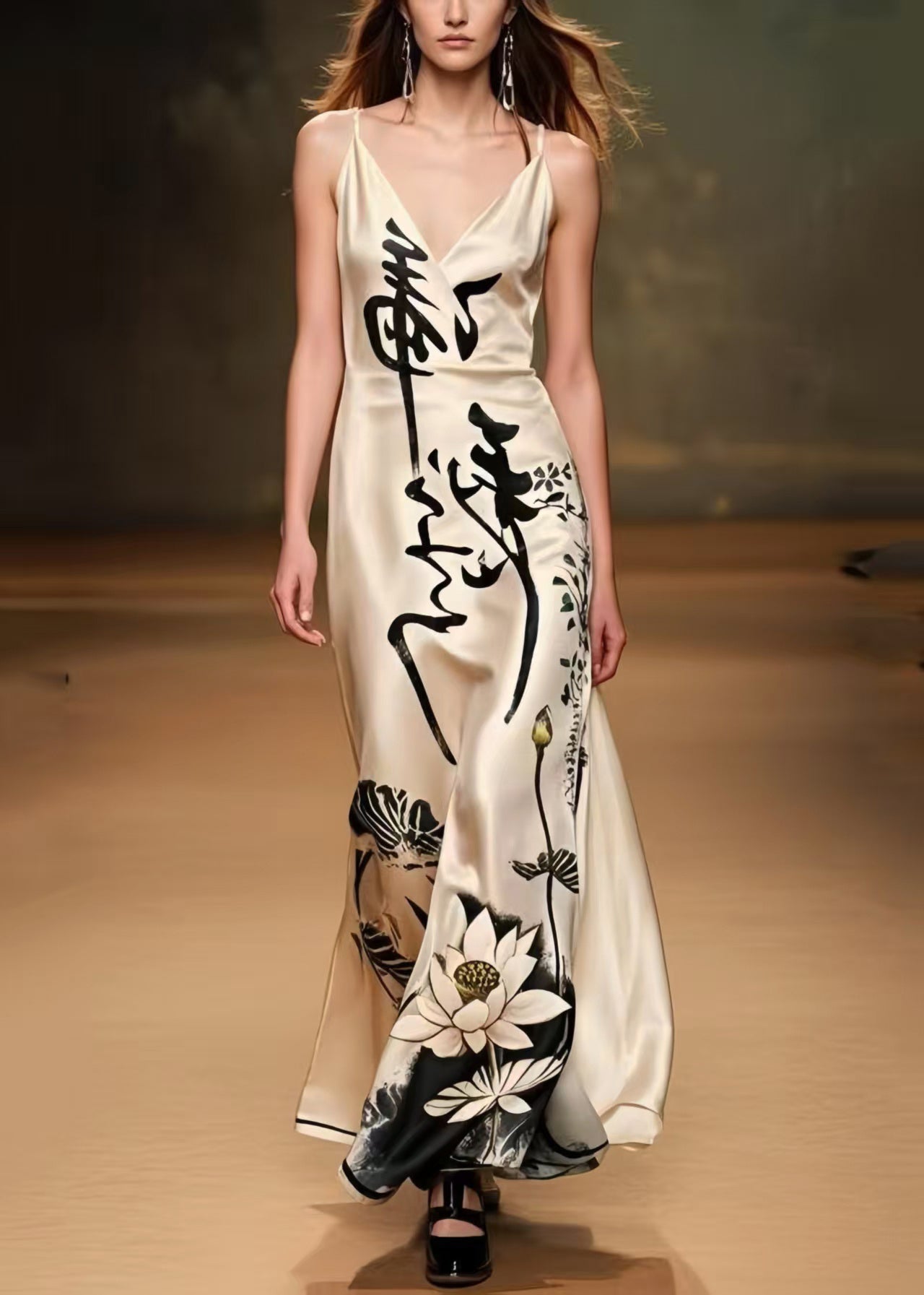 Fitted Apricot Print Draping Silk Party Dress Summer