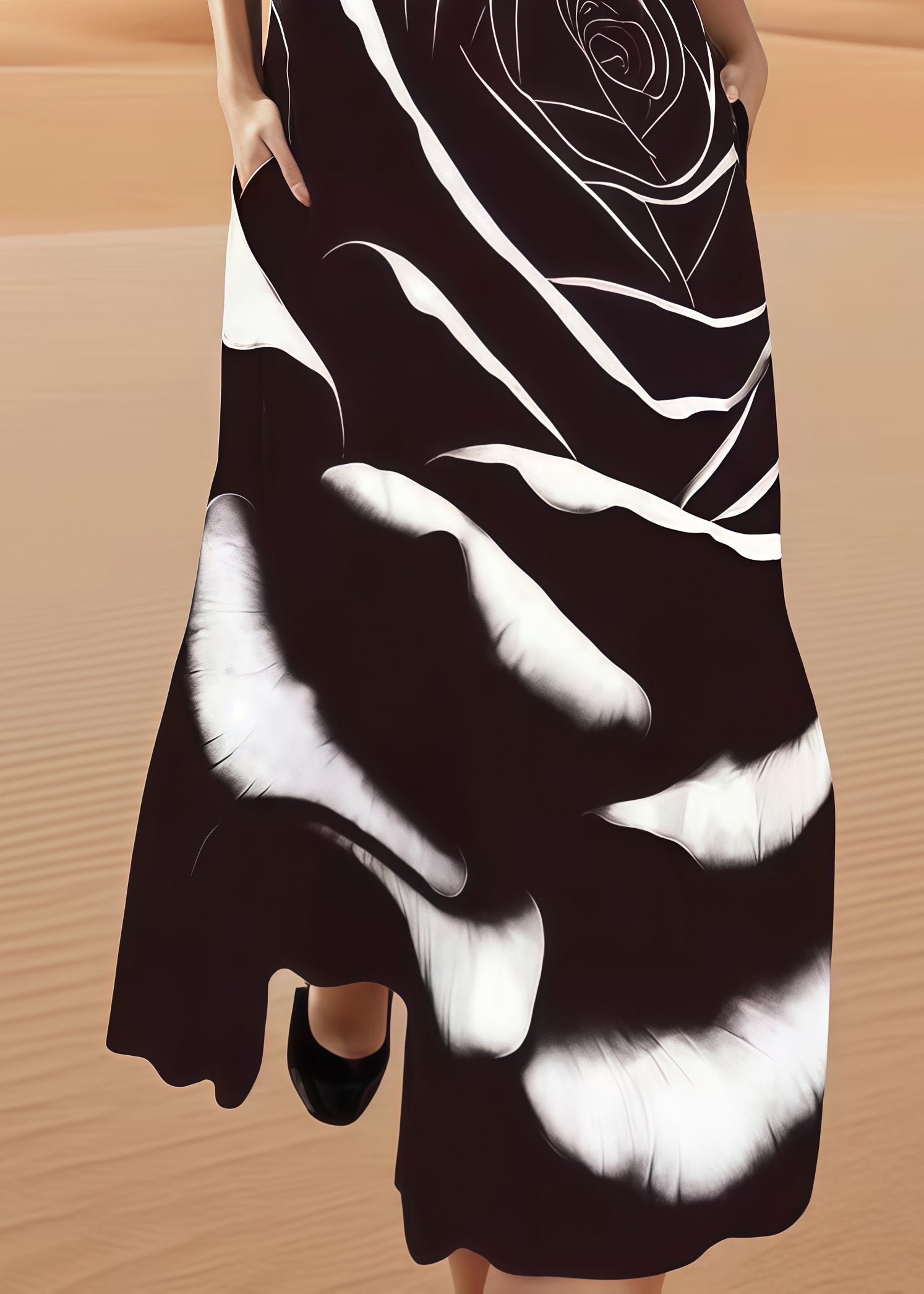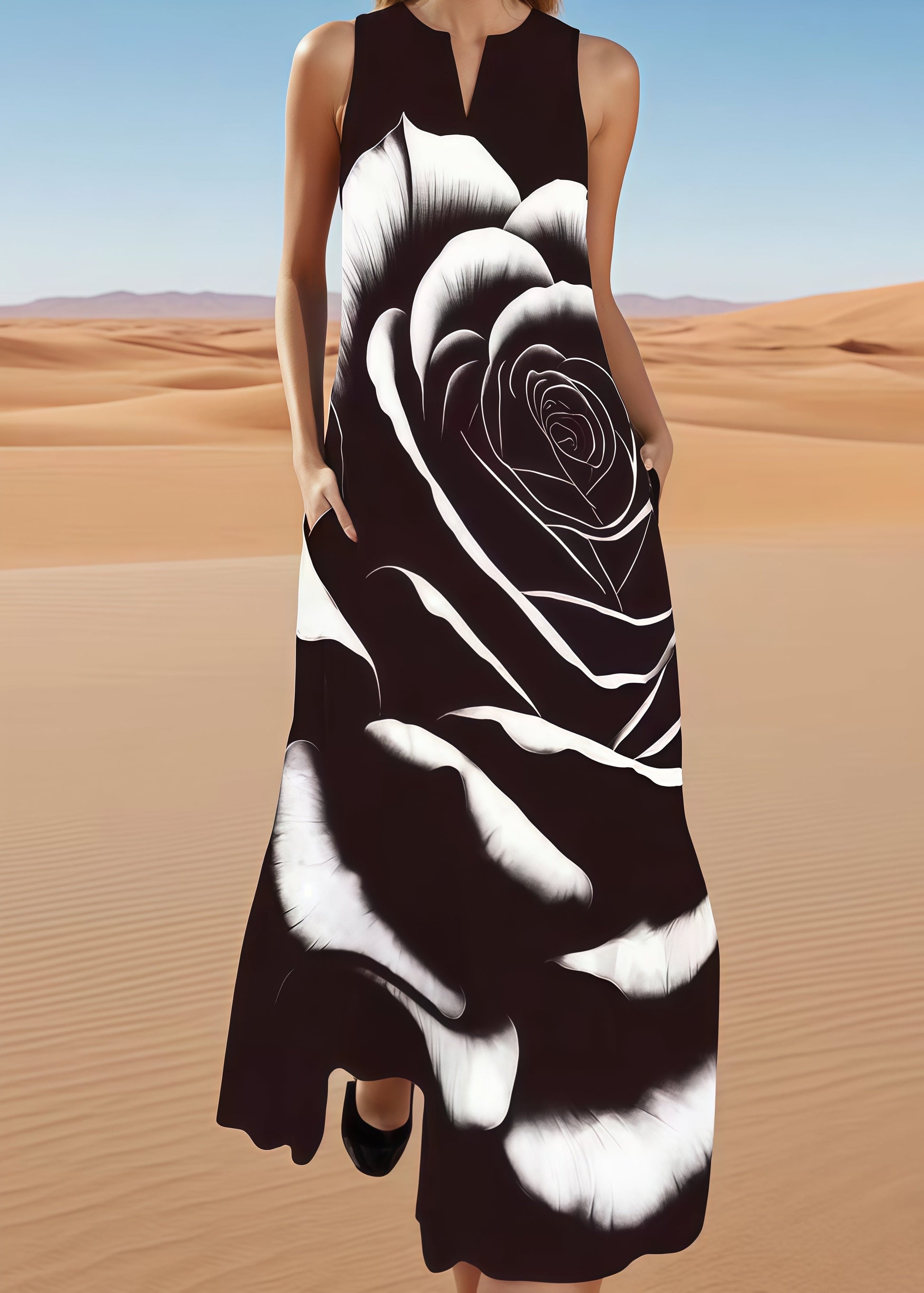 Fitted Black Oversized Floral Cotton A Line Dress Sleeveless