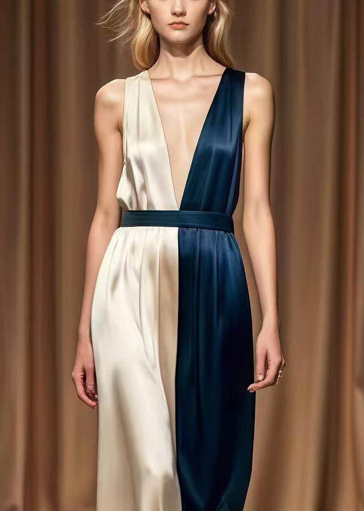 Fitted Colorblock Deep-V Neck Patchwork Silk Robe Dresses Summer