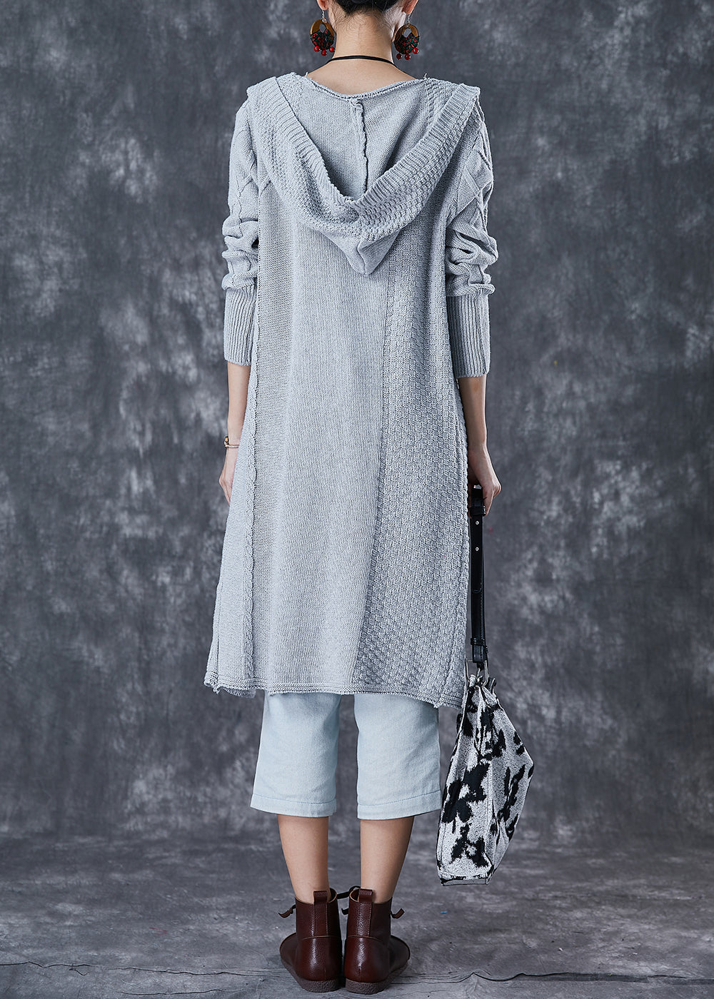 French Light Grey Hooded Cable Knit Loose Cardigan Fall