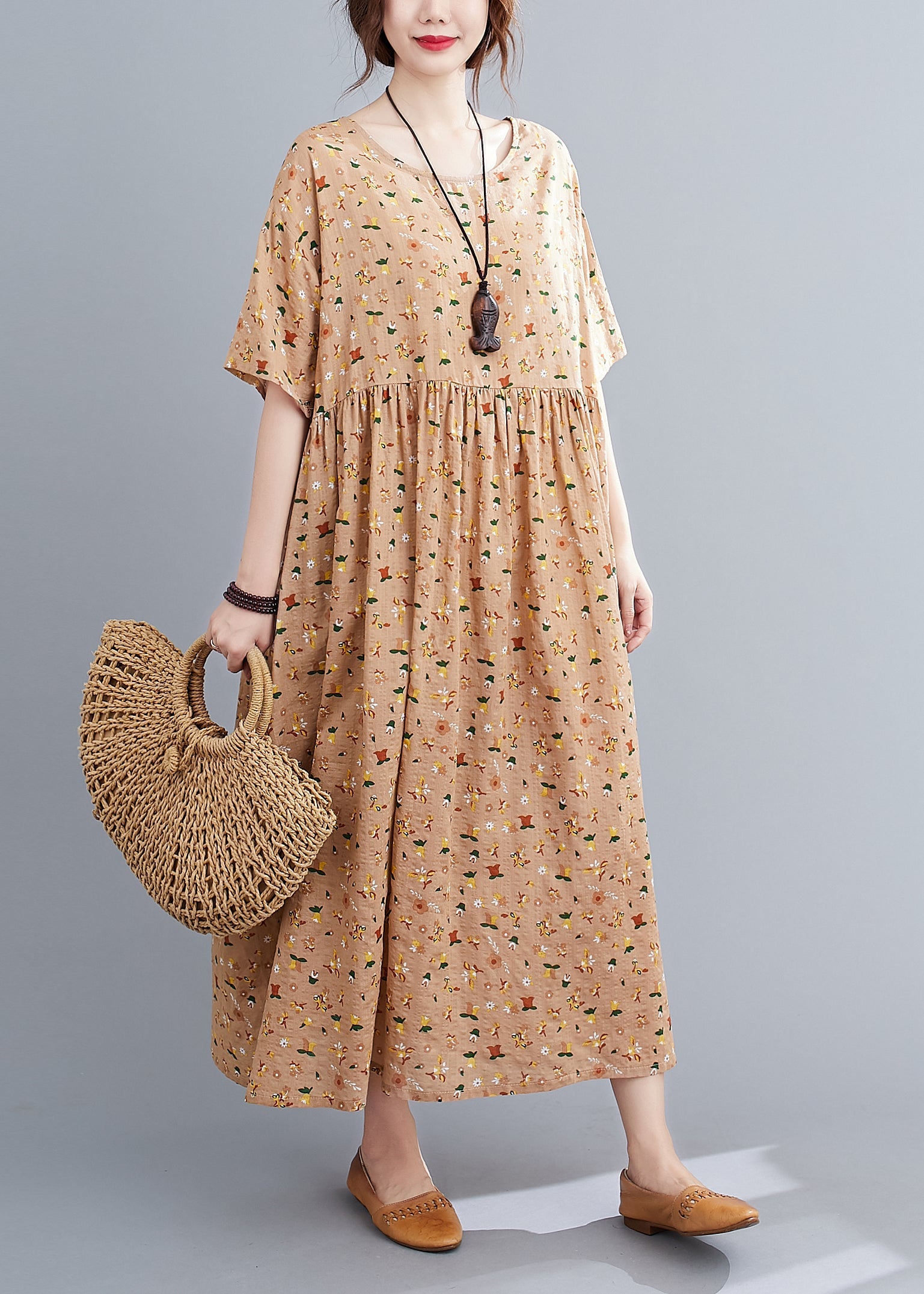 French Pink Orange O-Neck Wrinkled Print Cotton Loose Dresses Short Sleeve