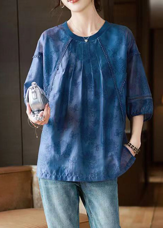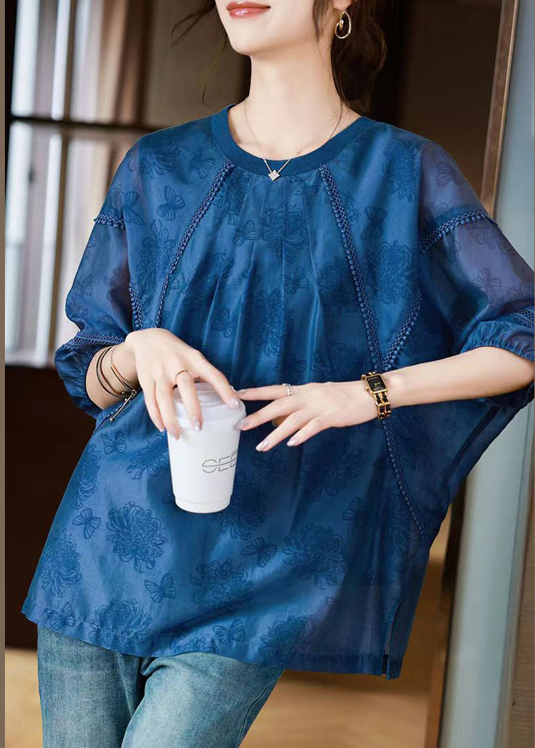 Handmade Blue O-Neck Butterfly Print Top Bracelet Sleeve