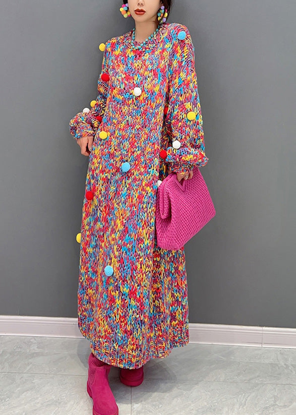Handmade O-Neck Print Fuzzy Ball Decorated Knit Long Sweaters Dresses Winter