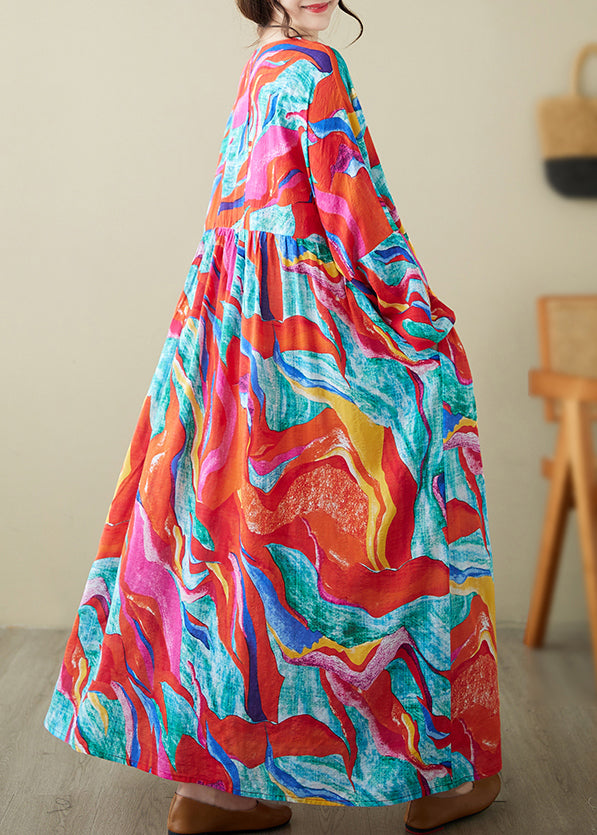 Holiday Style Red O-Neck Print Loose Cotton Long Dress Summer