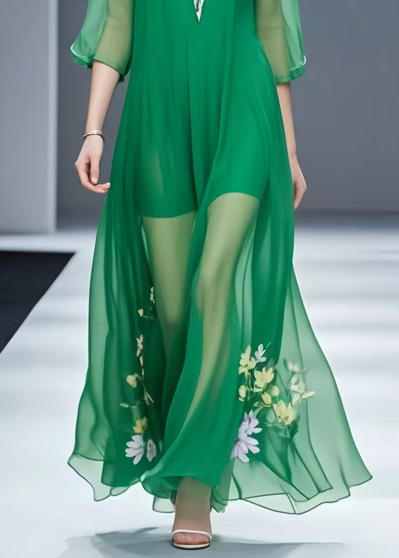 Italian Green Floral Chiffon Vacation Dresses Bracelet Sleeve