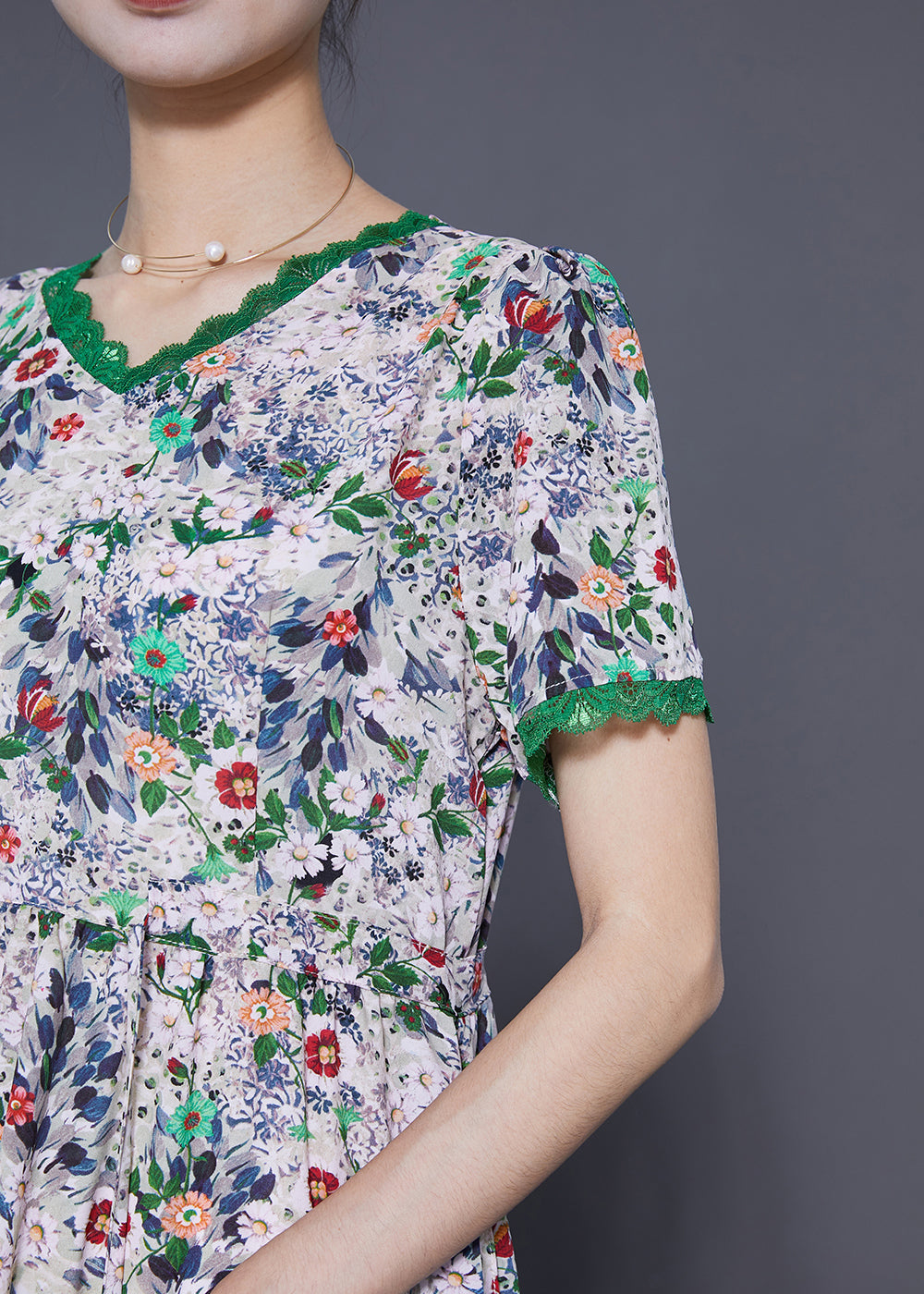 Italian Green Print Lace Patchwork Exra Large Hem Chiffon Dresses Summer
