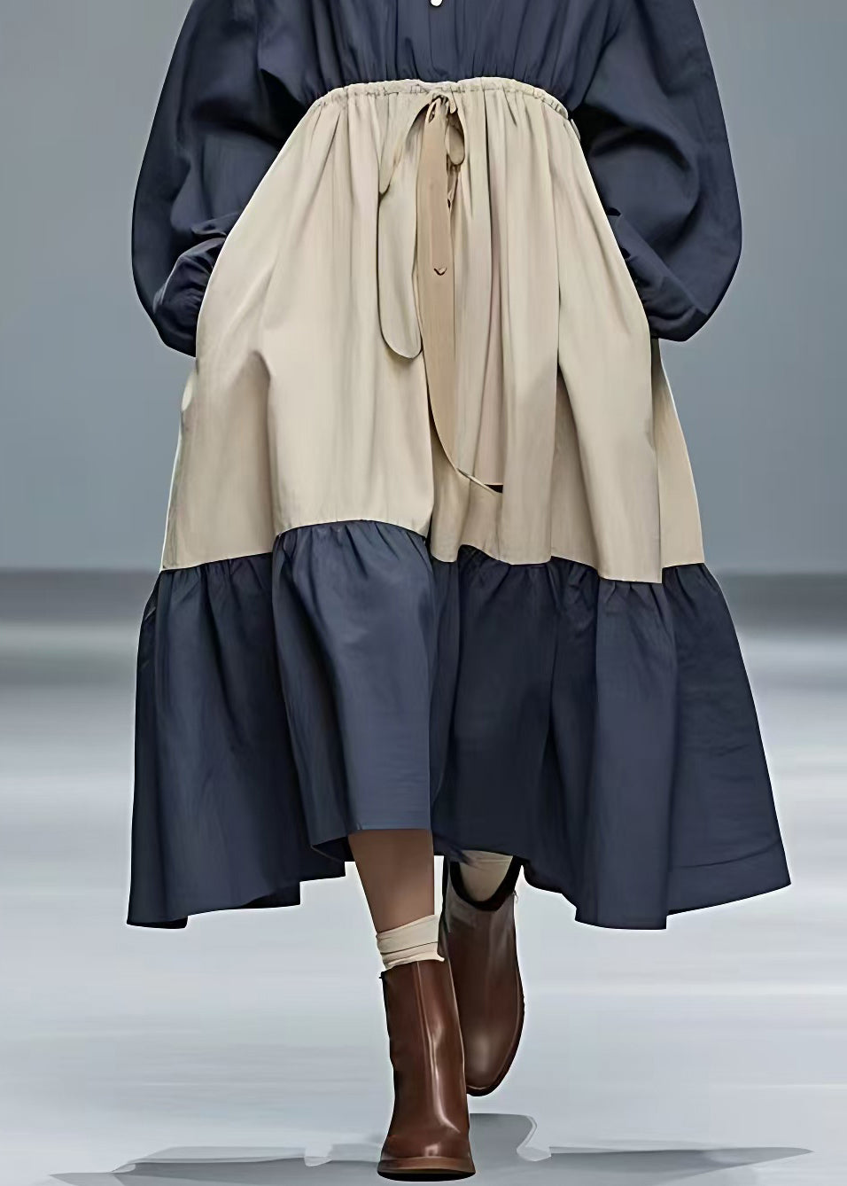 Italian Navy Lace Up Pockets Cotton Long Dresses Long Sleeve