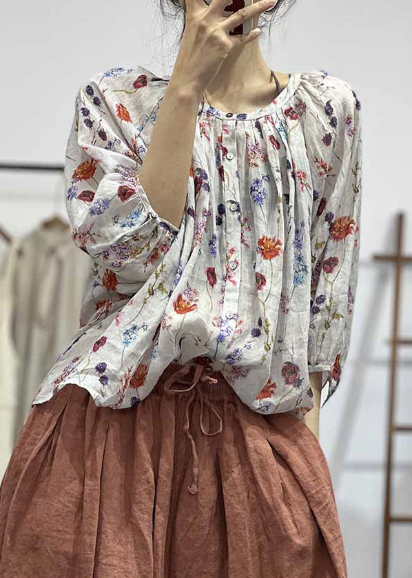 Loose White O Neck Print Button Cotton Shirt Bracelet Sleeve