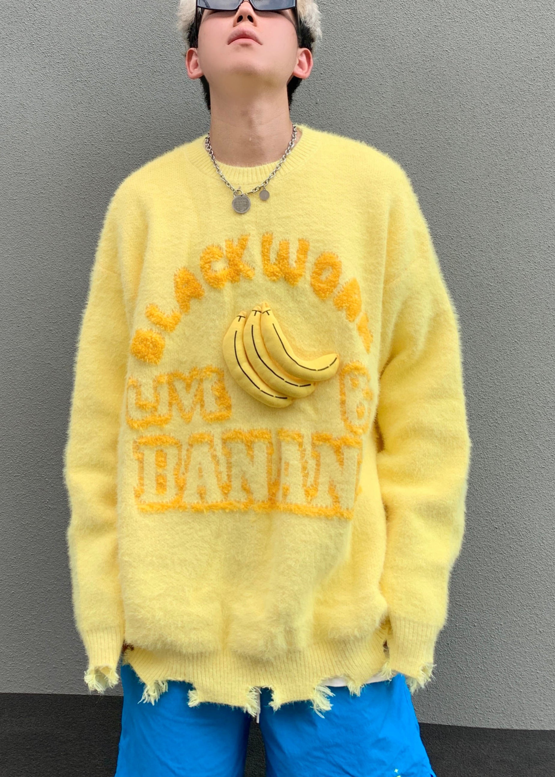 Loose Yellow Letter Cozy Patchwork Cotton Knit Sweater Winter