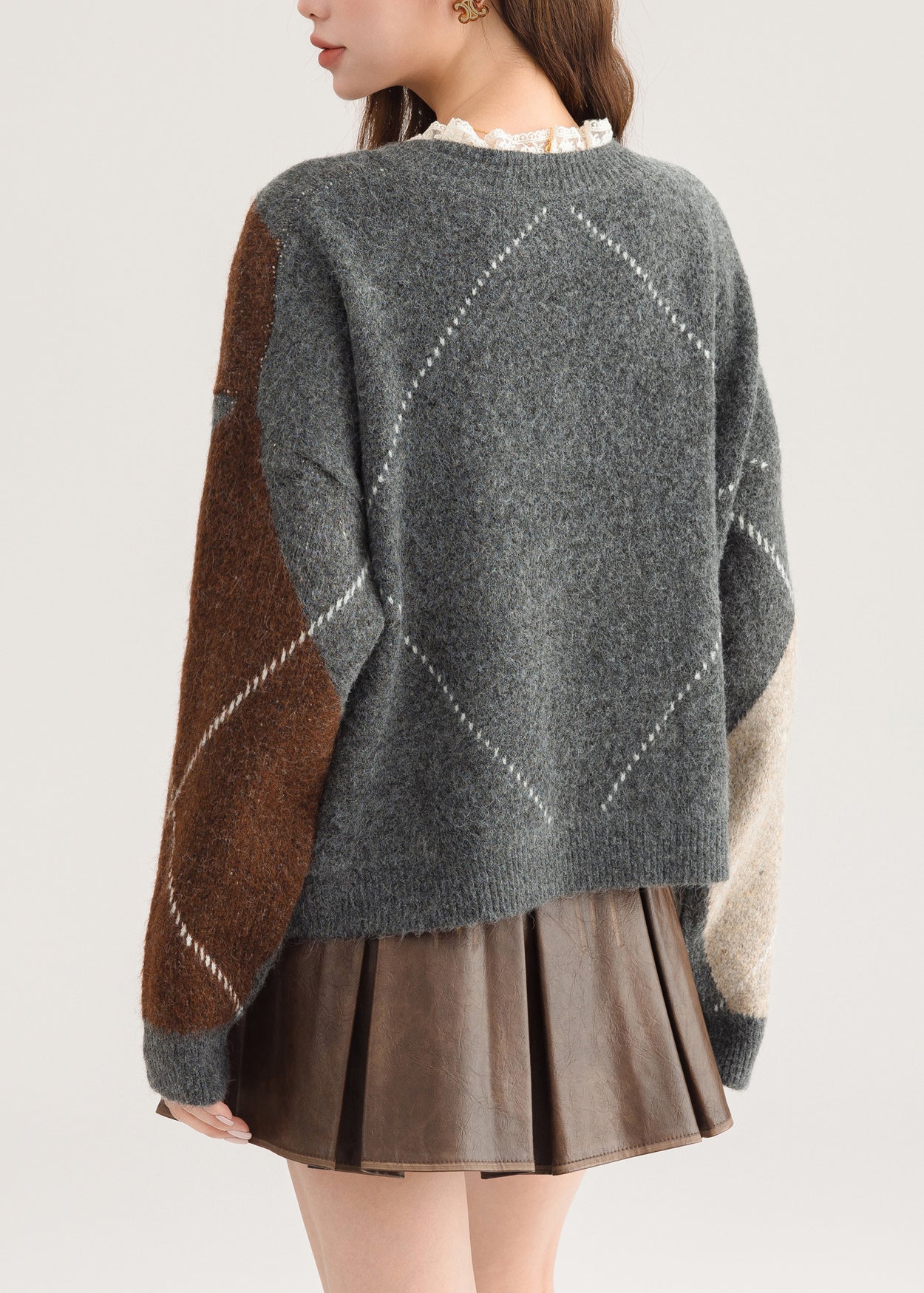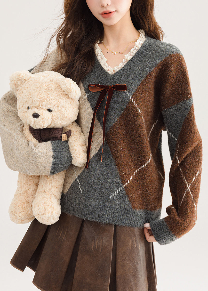 New Red V Neck Plaid Lace Patchwork Knit Sweater Spring