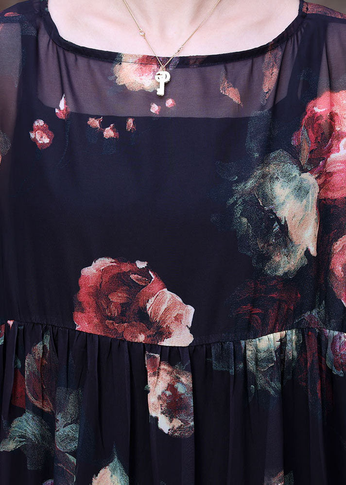 Plus Size Black O-Neck wrinkled Print Chiffon Beach Dress Two Pieces Set Summer